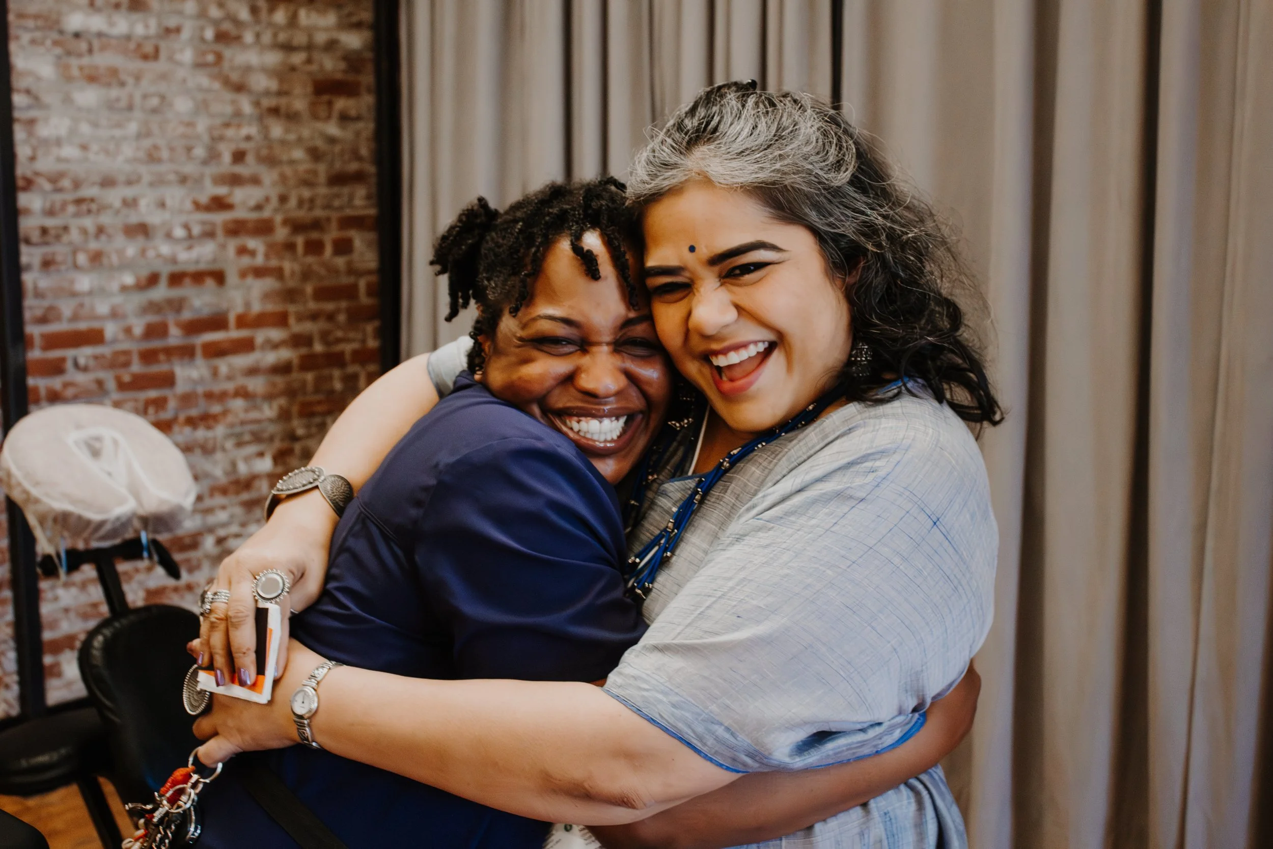 Two women hugging and smiling joyfully at the Mercatus Catering Event in Portland
