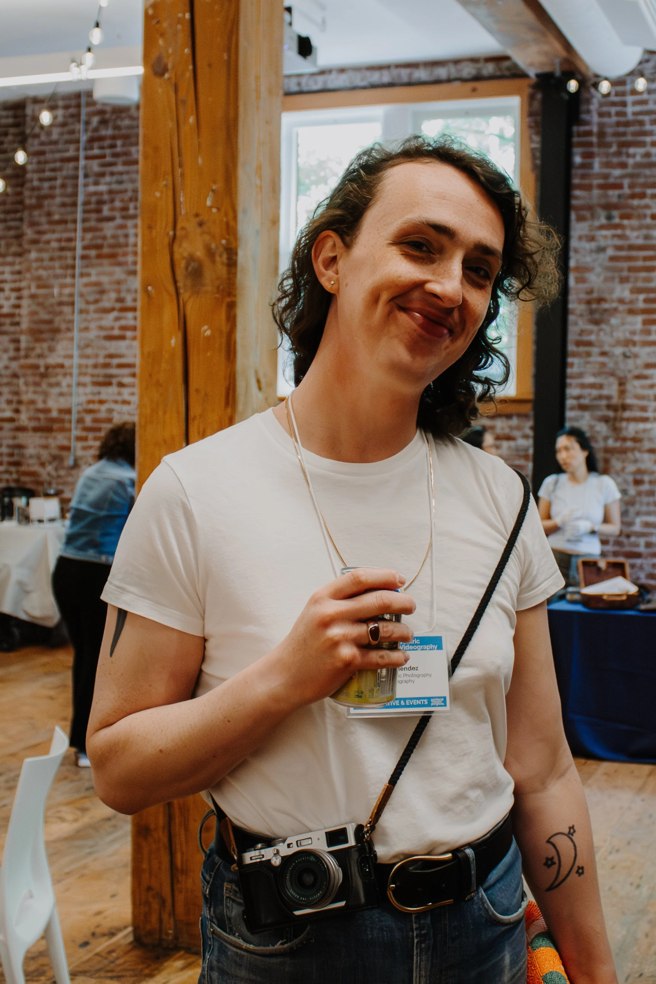 A person wearing a white T-shirt and a camera around their neck, smiling at the Mercatus Catering Event in Portland.
